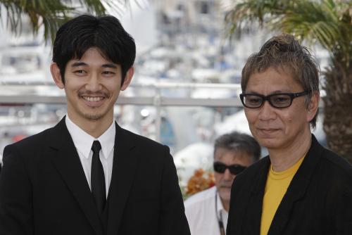 第64回カンヌ国際映画祭で、記者会見前に写真撮影に応じる三池崇史監督(右)と主演の瑛太