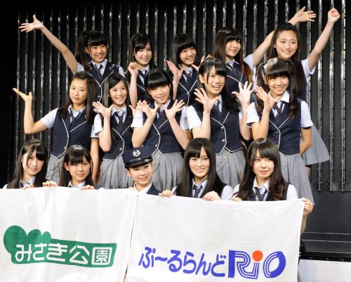 南海電鉄の遊園地「みさき公園」のイメージキャラクターに就任したNMB48=16日午後、大阪・難波