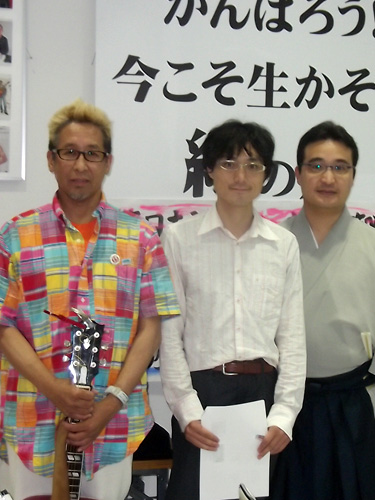 福島原発をテーマにトークショー&ミニライブを行った(左から)イ・ヨンボ、関学大・朴勝俊准教授、旭堂南陽