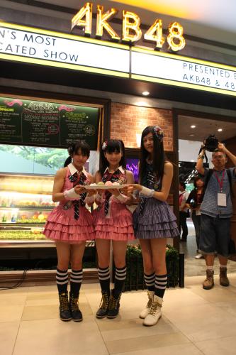 AKB48の公式カフェがこのほどシンガポールに開店し、竹内美宥(15)、島崎遥香(17)らメンバー3人がグランドオープンに駆けつけた。