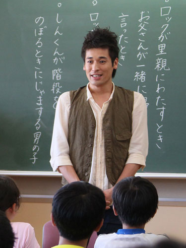 課外授業で児童の映画感想文発表後、笑顔で話す佐藤隆太