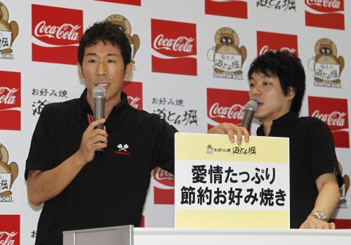 7日にフリーターの女性(23)と結婚したお笑いコンビ「麒麟」の田村裕(31)が11日、都内で行われた「お好み焼きレシピコンテスト」で相方の川島明(32)と司会を務めた。
