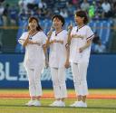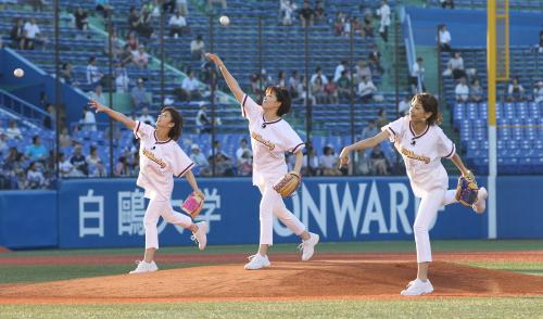 新曲「少しずつ 少しずつ」を披露後マウンドに並び、事前に石川に習ったフォームで一斉に投球。捕手まで届かなかった中野アナは「野球選手はやっぱり凄い。大歓声の中でできたのはいい思い出」と話した。