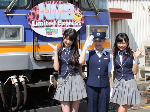 南海電鉄の特急サザンの一部車両が、アイドルグループNMB48のヘッドマークを付けて走ることになり13日、同社の車両基地でお披露目された。