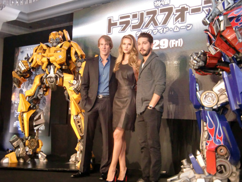 人気SFシリーズ第3弾「トランスフォーマー/ダークサイド・ムーン」(29日公開)のマイケル・ベイ監督(46)主演のシャイア・ラブーフ(25)ロージー・ハンティントン=ホワイトリー(24)が16日、大阪市内で来日会見した