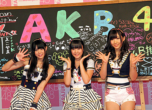 アイドルグループ「AKB48」の多田愛佳(16)、前田亜美(16)、岩佐美咲(16)が27日、都内で行われた「AKB48 OFFICIAL SHOP HARAJUKU」グランドオープン記念記者発表会に登場した。店内ディスプレイ用に前田敦子(20)、大島優子(22)ら人気メンバーが描いた黒板の落書きに彼女たちも自らの絵を加え、グランドオープンに華を添えた。