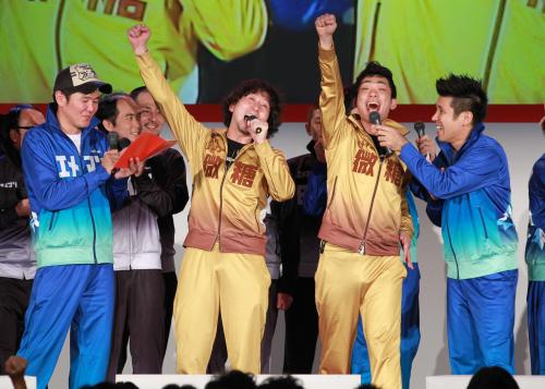 優勝したイシバシハザマは声を合わせて「やったあー」とガッツポーズ。石橋尊久(35)は「嫁に“子供のミルク代頼むね”と言われて来たので、めっちゃうれしい!」と絶叫。相方の硲陽平(29)も「これでおいしいものを食べたい」と大喜びだった。