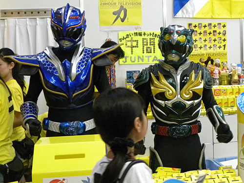沖縄県のご当地戦隊ヒーロー「琉神マブヤー」が21日、「24時間テレビ」の大阪会場で募金を呼びかけた。