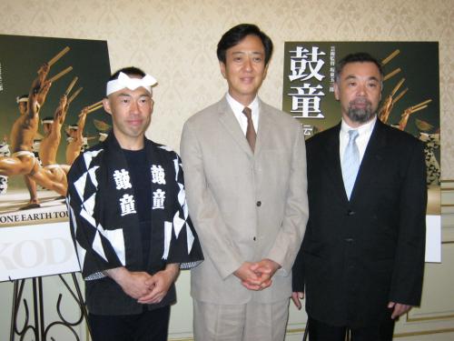 「鼓童」芸術監督に就任する坂東玉三郎(中央)と新代表の見留知弘(左)、現代表の青木孝夫氏
