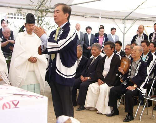 上方落語協会会長の桂三枝(68)や相談役を務める桂春団治(81)らが13日、大阪市内で開かれた来年4月完成予定の同協会会館の地鎮祭に出席した。