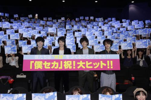 『僕たちは世界を変えることができない』の初日舞台挨拶をする(左から)柄本佑、向井理、松坂桃李、窪田正孝