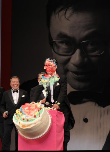 新作「ステキな金縛り」(29日公開)の上映を前に、西田敏行(63)役所広司(55)ら三谷作品に出演した大物俳優14人とともに登壇。自ら全員の登場テーマを選曲し、回転舞台を使った演出も考えた。俳優陣からはメッセージが送られ、佐藤浩市(50)は「勘違いするなよ三谷幸喜!小さくまとまるなよ三谷幸喜」と激励した。三谷監督は「この50年は通過点。次の50年で花開き、次の50年で歴史に名を残す。長寿日本一として」と真顔で抱負を述べた。