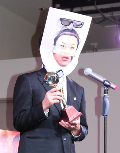 今回は、政界部門で受賞した枝野幸男経済産業相(47)に代わって「直ちに人体に影響はありません」、文化交流会部門は韓国俳優チャン・グンソク(24)で「マッコリ、ありがとう」、文化界部門はコラムニストで女装タレントのマツコ・デラックス(38)で「女子アナ!結婚でも何でもすればいいわよ!名前は言わないけどさぁ」などと見事な“あごマネ”を披露し、笑いを誘っていた。