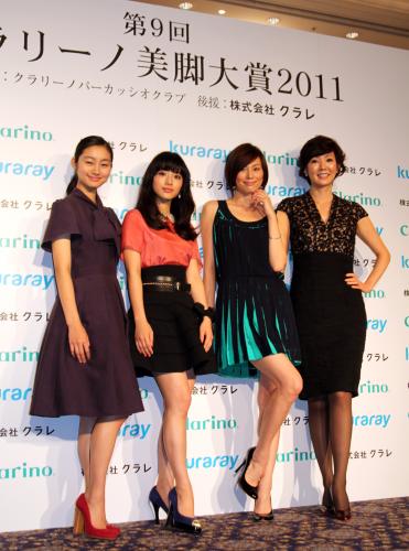 女優の石原さとみ(24)が19日、都内のホテルで行われた「第9回クラリーノ美脚大賞2011」の表彰式に出席。忽那汐里(18)米倉涼子(36)とよた真帆(44)とともに、美脚を強調する華やかなドレス姿で登場した。