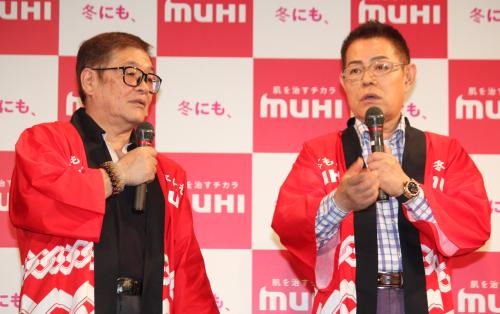「池田模範堂 冬にもMUHI」PRイベントにハッピ姿で登場した仲本工事(左)と加藤茶