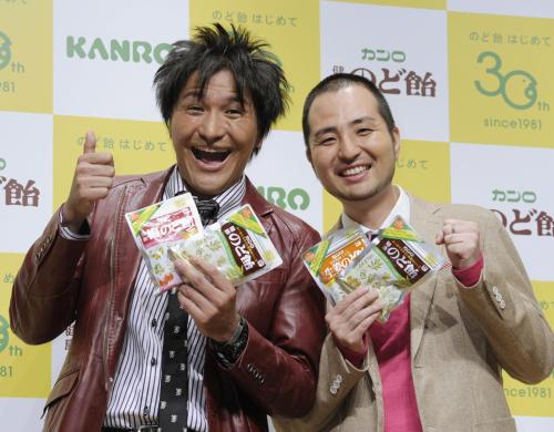 カンロの「のど飴の日」制定記念イベントが東京都内で開かれ、沖縄出身のお笑いコンビ「スリムクラブ」と歌手の谷村新司が登場。独特のハスキーボイスで知られる真栄田賢は「この声で呼んでいただけるなんて。カンロさんの英断に感謝です」と頭を下げた。