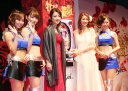 サンセイアールアンドティ「CR 牡丹と薔薇」新機種発表会に登場し、名セリフを決めて照れる小沢真珠(左)と大河内奈々子