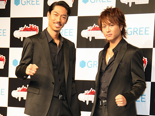 EXILEのAKIRA(30)とTAKAHIRO(26)が21日、都内で行われた「GREE(グリー)」の人気ソーシャルゲーム「聖戦ケルベロス」新CM発表会に出席した。