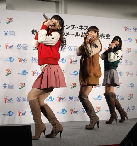 新曲を披露するフレンチ・キスの(左から)柏木由紀、高城亜樹、倉持明日香