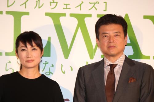 「RAILWAYS 愛を伝えられない大人たちへ」完成報告会見に出席した(左から)余貴美子、三浦友和