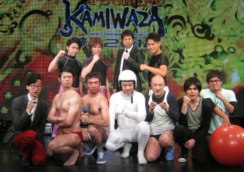 「KAMIWAZA~神芸2012」制作発表に出席した後列左から「桔梗ブラザーズ」篤と崇、今田耕司、矢部亮、後列左から、もりやすバンバンビガロ、「品川庄司」庄司、「ペナルティ」ワッキー、「FUJIWARA」原西孝幸、くまだまさし、「平成ノブシコブシ」吉村崇と徳井健太