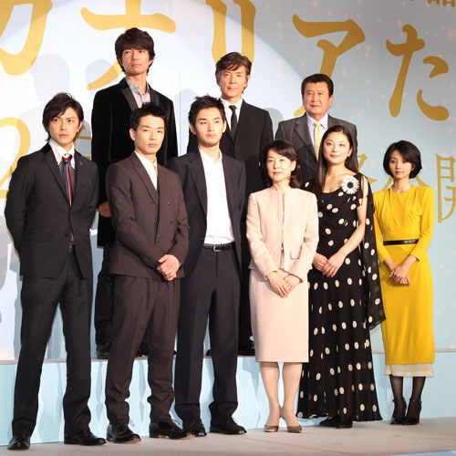 「北のカナリアたち」フォトセッションに臨んだ(前列左から)勝地涼、森山未來、松田龍平、吉永小百合、小池栄子、満島ひかり(二列目左から)仲村トオル、柴田恭平、里見浩太朗