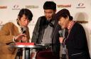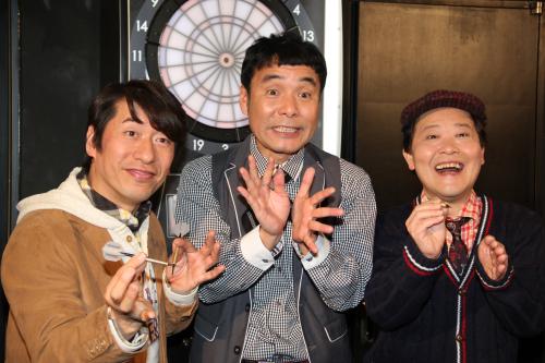 <「ダチョウ倶楽部 スマートフォンアプリリリース プレス発表会」>ダーツ対決に挑んだダチョウ倶楽部の(左から)寺門ジモン、肥後克広、上島竜兵