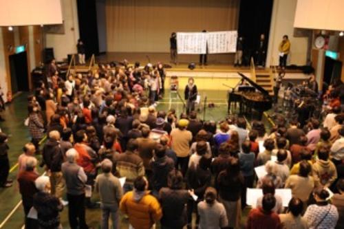 ボランティアで参加したのは地元の4歳から78歳までの約200人。津波被害から再生されたピアノの伴奏でホールいっぱいに歌声を響かせた。全員の気持ちが一体となったコーラスに「こんなにたくさんの人たちに集まっていただき感動です」。