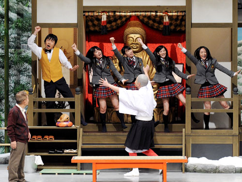 はなさき寺を舞台に繰り広げるコメディーで、4人ははなさき高校ダンス部員役。藤井隆(39)とともにデビューシングル「絶滅黒髪少女」の振り付けなどを披露し、なんばグランド花月を沸かせた。