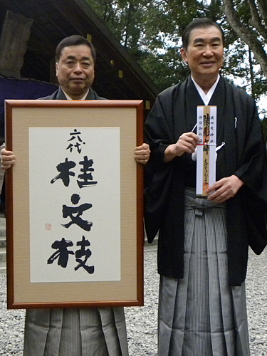 猿田彦神社で六代桂文枝襲名の報告と披露公演の成功を祈願した桂三枝(右)