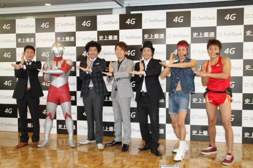 SoftBank 4G」サービス開始記念イベントに出席した(左から)サバンナ・高橋、ウルトラマン、トータルテンボス・藤田、大村、2700・八十島、常道、サバンナ・八木