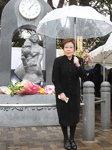 平和の母子像「時忘れじの塔」記念式典に出席した海老名香葉子さん