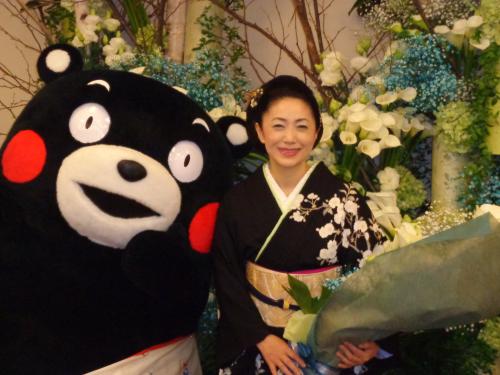 出身の熊本のキャラクター「くまモン」から花束を贈られた石川さゆり
