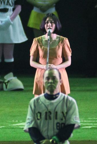 「君が代」をパワフルに熱唱。国歌独唱は11年10月11日に行われたサッカー日本代表のW杯3次予選タジキスタン戦(長居)以来2回目。「野球場は独特の雰囲気があり、めっちゃ緊張しましたが、思ったよりもうまく歌えました。球場で歌うのはもちろん球場に来たのも初めて。でも、野球は大好きなので今度は始球式をやりたい」と意欲的だった。