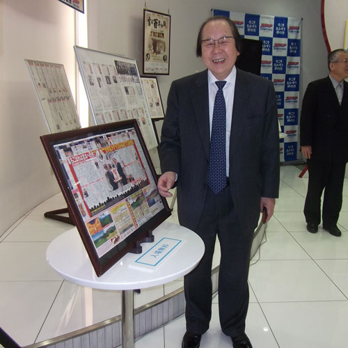 100年の歴史を彩る貴重な写真やグッズが展示された館内には、記念すべき第1回の連載紙面も飾られた。2009年1月1日付で、当時社長だった吉野会長を本紙の山本進社長(当時)が直撃。「この元旦に、間寛平がアースマラソンで千葉県鴨川市から北米へ出発した。長いような、短いような…」と感慨深げに語り、本紙連載に見入っていた。