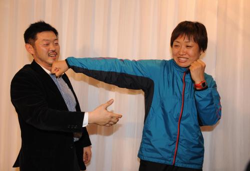 しずちゃんはとびきりの笑顔で会見場に登場した。「山崎静代です。私は元気です。良かった。ホッとした」。医師からボクシング活動継続にお墨付きが出て、終始笑みが絶えなかった。