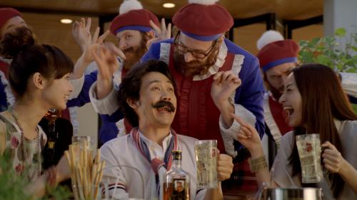 大泉が自宅で友人たちとハイボールを作っていると、突然音楽が流れ始める。「今、おいしぃ~の作って…」と言い掛けた大泉の手が止まる。音楽とともに登場したのは「キング・オブ・ブレンダーズ」に扮した4人の外国人。「来たよ~!またヒゲつける気でしょ!」。大泉の予感は正解で、4人は音楽に合わせて踊りながらヒゲをつけようとする。