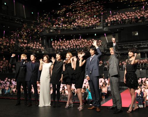 映画「GIRL」舞台あいさつで(左から)深川栄洋監督、林遣都、壇れい、板谷由夏、香里奈、吉瀬美智子、向井理、上地雄輔、波瑠がテープが舞い散る演出にびっくり