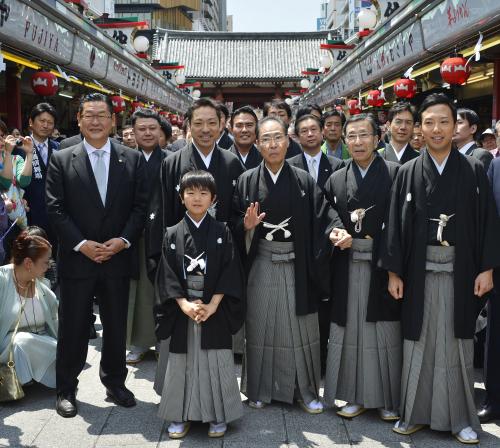 浅草は、初代と二代目猿之助が生まれた縁のある地だという。五代目市川団子として初舞台を踏む香川の長男政明君(8)や、一門の市川右近(48)らも参加。