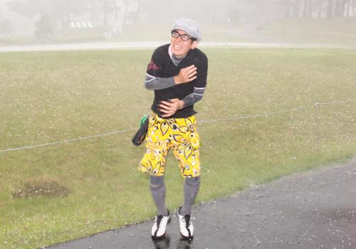 午前中は快晴に恵まれ、笑顔でラウンドする芸能人参加者たちだったが、午後になると天気が一変。瞬く間に暗雲が立ち込め、雷が鳴り、大粒のひょうが降り始めた。