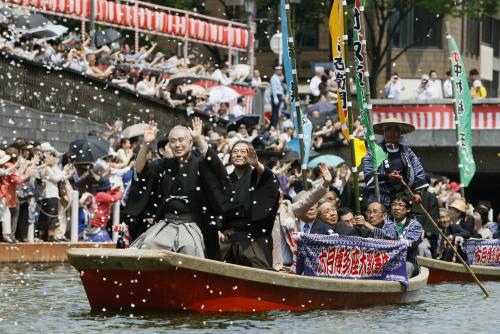 汗ばむほどの天気になった福岡。紙吹雪が舞う中、舟に乗ったはかま姿の俳優に、見物客が「播磨屋!」などと声を掛けた。
