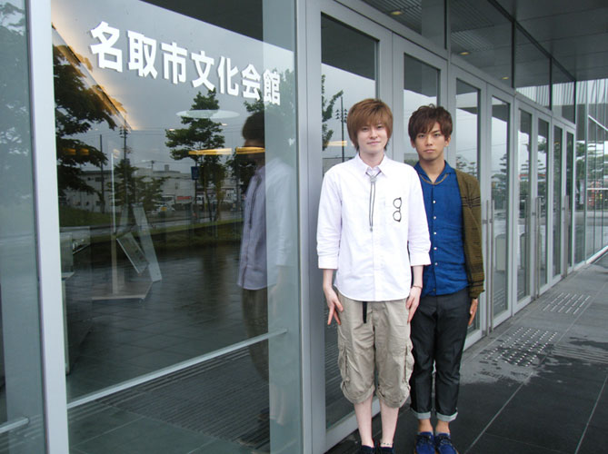 人気漫画が原作のミュージカル「テニスの王子様 青学VS立海」に出演する俳優平牧仁(25)と木村敦(20)がこのほど、昨年の東日本大震災 後に避難所として使用された宮城県名取市文化会館を訪れた。