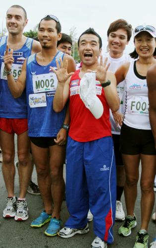 17日、プノンペン国際ハーフマラソンのスタート前に、ポーズをとる猫ひろし(中央)とヘム・ブンティン(左から2人目)