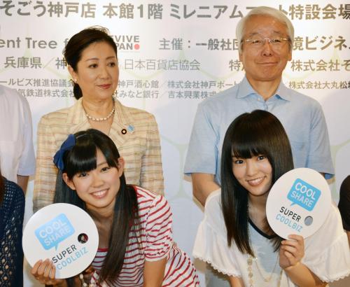 「スーパークールビズ」をPRするイベントが18日、神戸市の百貨店で開かれ、AKBの姉妹グループで大阪のアイドルグループNMB48の山本彩(18)と渡辺美優紀(18)がファッションショーに登場した。
