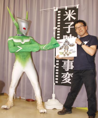特撮映画の製作発表で、ポーズをとる鳥取県米子市のご当地キャラ「ネギマン」と監督の赤井孝美さん