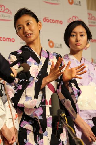 女優の菊川怜(34)、忽那汐里(19)、宮崎香蓮(18)が5日、都内で行われたネットドラマ「otogi★story」の完成披露上映会に出席した。