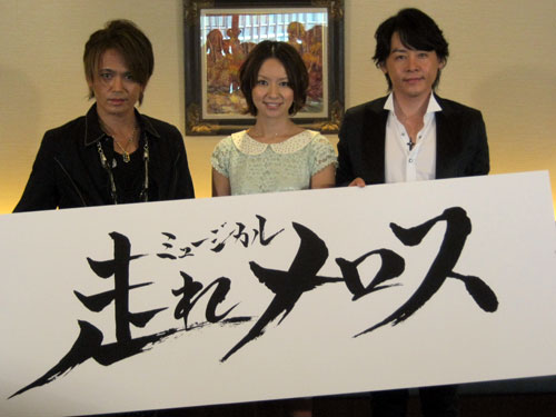 ミュージカル「走れメロス」の制作発表に出席した、左から、諸星和巳、鈴木亜美、河村隆一