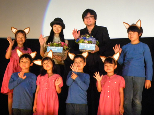 主人公・花の声を担当。「真っさらな気持ちで見てほしい。宮崎あおいが声をやってることが皆さんの頭から消えて、花のキャラが動きだしたらうれしい」と語った。舞台には、“おおかみこども”ならぬ大阪市内の小学生“おおさかこども”6人が登場し、宮崎に花束を贈呈。「かわいいですね」と笑顔だった。