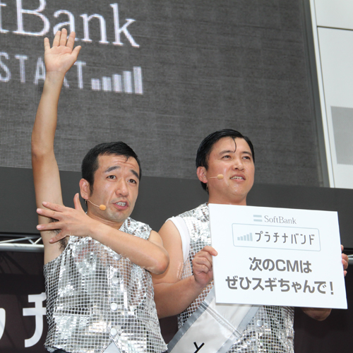 ソフトバンク「プラチナバンド(900MHz)スタート記念イベント」に登場し、CM出演を訴える猫ひろし(左)とスギちゃん