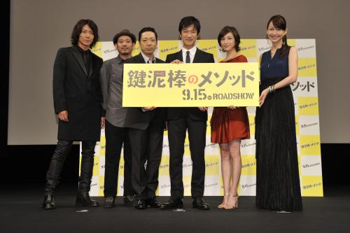 都内で舞台あいさつした(右から)森口瑤子、広末涼子、堺雅人、香川照之、内田けんじ監督、吉井和哉